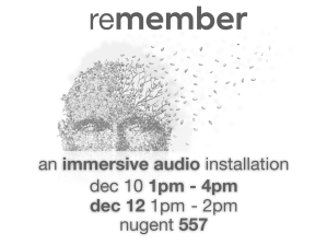 remember is an immersive audio installation that presents an abstract simulation of dementia using audio to immerse the participants into a forgetful world. Inspired by his encounters with his own grandmother experiencing Dementia, Matthew recorded dozens of hours of questions family members had asked her. These questions, combined with ambient recordings of elder care facilities and musical elements comprise everything you hear in remember. This piece serves both as a simulation of what is like to suffer from Dementia, and also poses the question of how we should care for / converse with those who suffer from different types of Alzheimer’s.