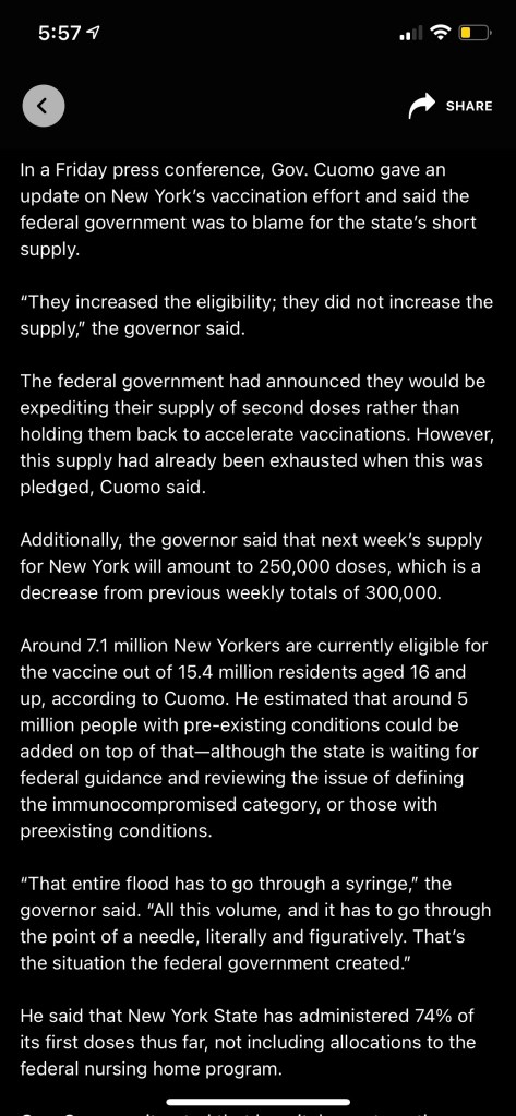 - See the screenshot below from the update that Gov. Cuomo shared on January 15, 2021… which may explain some of the issues many NYC locations are experiencing.