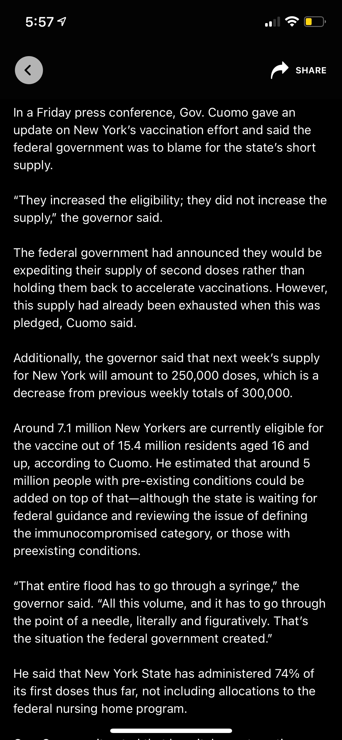 - See the screenshot below from the update that Gov. Cuomo shared on January 15, 2021… which may explain some of the issues many NYC locations are experiencing.
